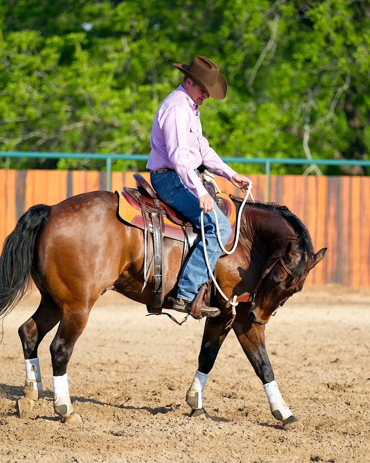 The horse should remain walking the circle, keeping the shape by himself with slack in the reins. Pull in the direction of your hips and when the horse softens laterally and vertically, drop both hands back to your kneecaps. When applying the spur, turn your toe out and roll your heel up. As a general rule, I like to roll with the spur because it lifts the horse’s ribcage up a little more and he doesn’t resent it as much as when you stab or poke him with the spur. You will be able to accomplish this exercise much more effectively if you are wearing spurs. You can do the exercise without spurs, but it may take a little bit longer to get the horse to understand and you’ll have to be more conscious of maintaining forward energy because he will probably be lazier.