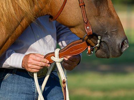 Be sure that the loops around the horse’s neck are not big enough for a hoof to get through if the horse should lower his head to the ground, nor should the loops be so loose that they are able to come off over the horse’s head. The easiest way to prevent this is to either shorten the reins before you start or simply tie another half-hitch or two to snug it up a bit—not too tight, of course.
