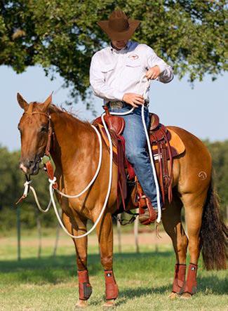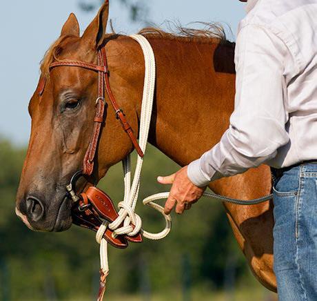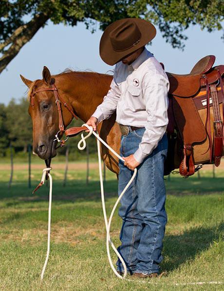 For either option, the slack in the rope should hang down slightly lower than the loop rein, hanging 2 to 3 inches below it. Reason being that you don’t want the lead to hinder the horse’s head if you are flexing to the right when mounted. If the lead is too short, your horse can’t flex far enough because he’ll run into pressure.