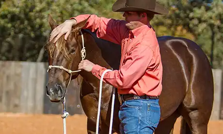 Always rub the horse with a lot of feel to your hand. Rubbing is a soothing sensation that will relax and comfort him. Patting doesn’t feel comfortable to the horse and will make him want to get away from you.