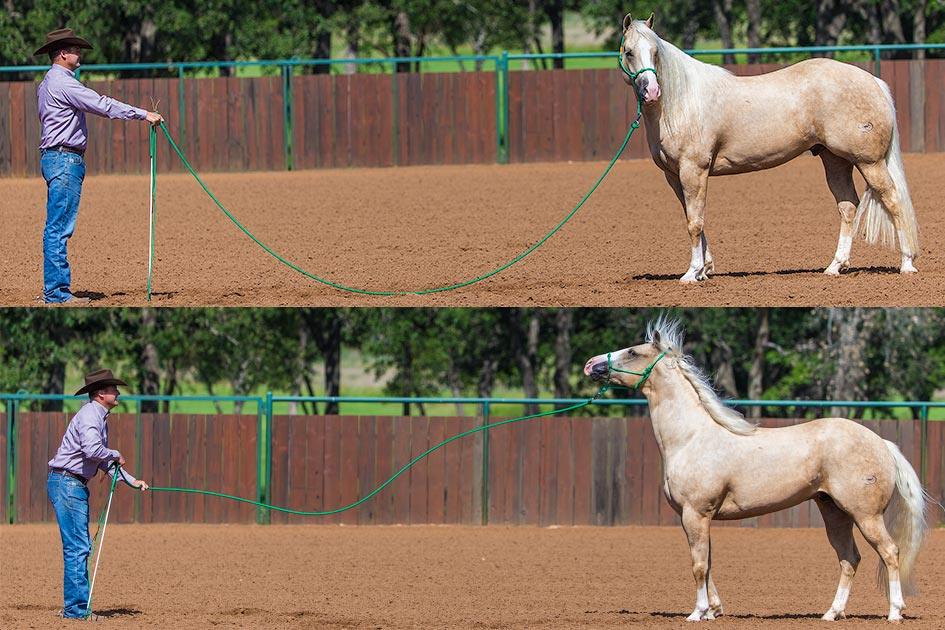 Horses never get any lighter than the first amount of pressure you apply to them. So even if you know the horse isn’t going to back out of your space when you gently tap the rope, always start by asking him with light pressure. With repetition, he’ll learn to back away as soon as you make a suggestion.