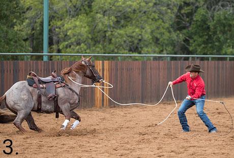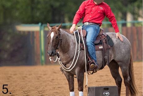 After five to 10 minutes of hustling the horse’s feet, the horse will start to look for a place to rest. Let him rest, but only beside the mounting block. It won’t take long for the horse to realize that the best place to be is beside the mounting block because it’s the only place he’s allowed to rest and get his air back.